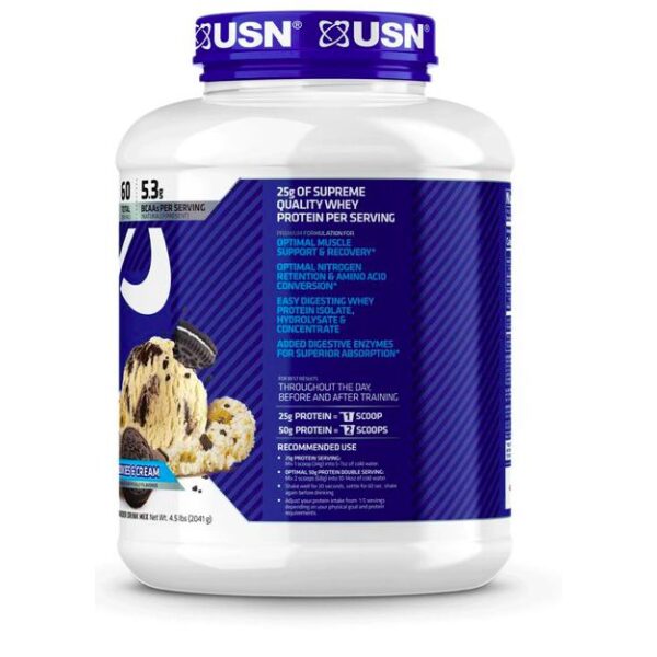 Compuesto de concentrado de proteína de suero de leche, aislado e hidrolizado, USN Blue Lab Whey ofrece 25 g de proteína por porción, 5200 mg de BCAA, lo que lo hace perfecto para el mantenimiento de la masa muscular magra.